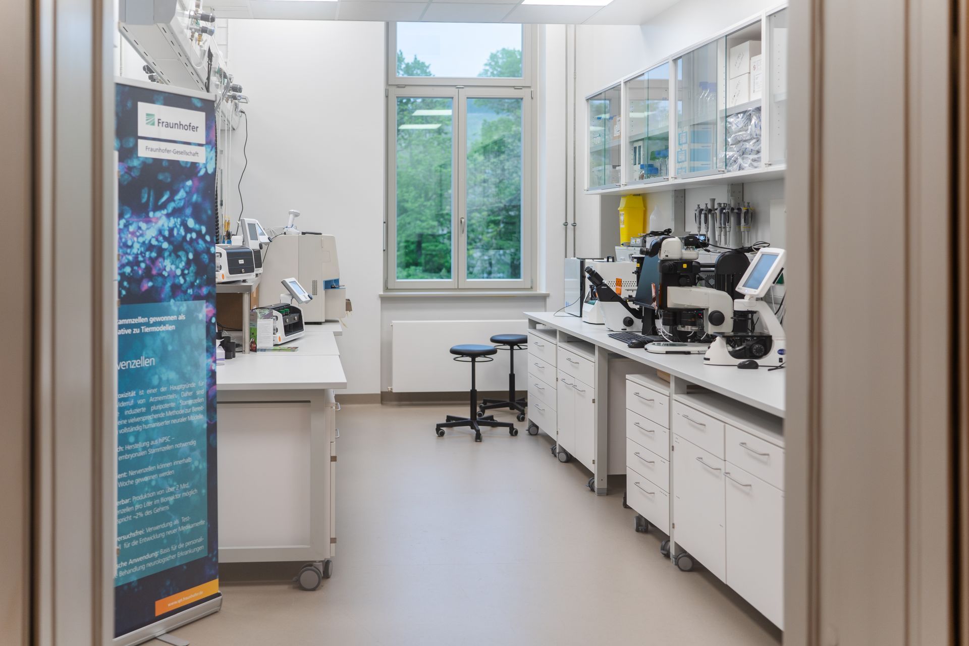 18 Laborräume (2.OG) + Kryolager, diverse Büroräume (1.und 3. OG), 7 UV-Räume, div. Technikzentralen (UG und DG), Gaslager im Außenbereich