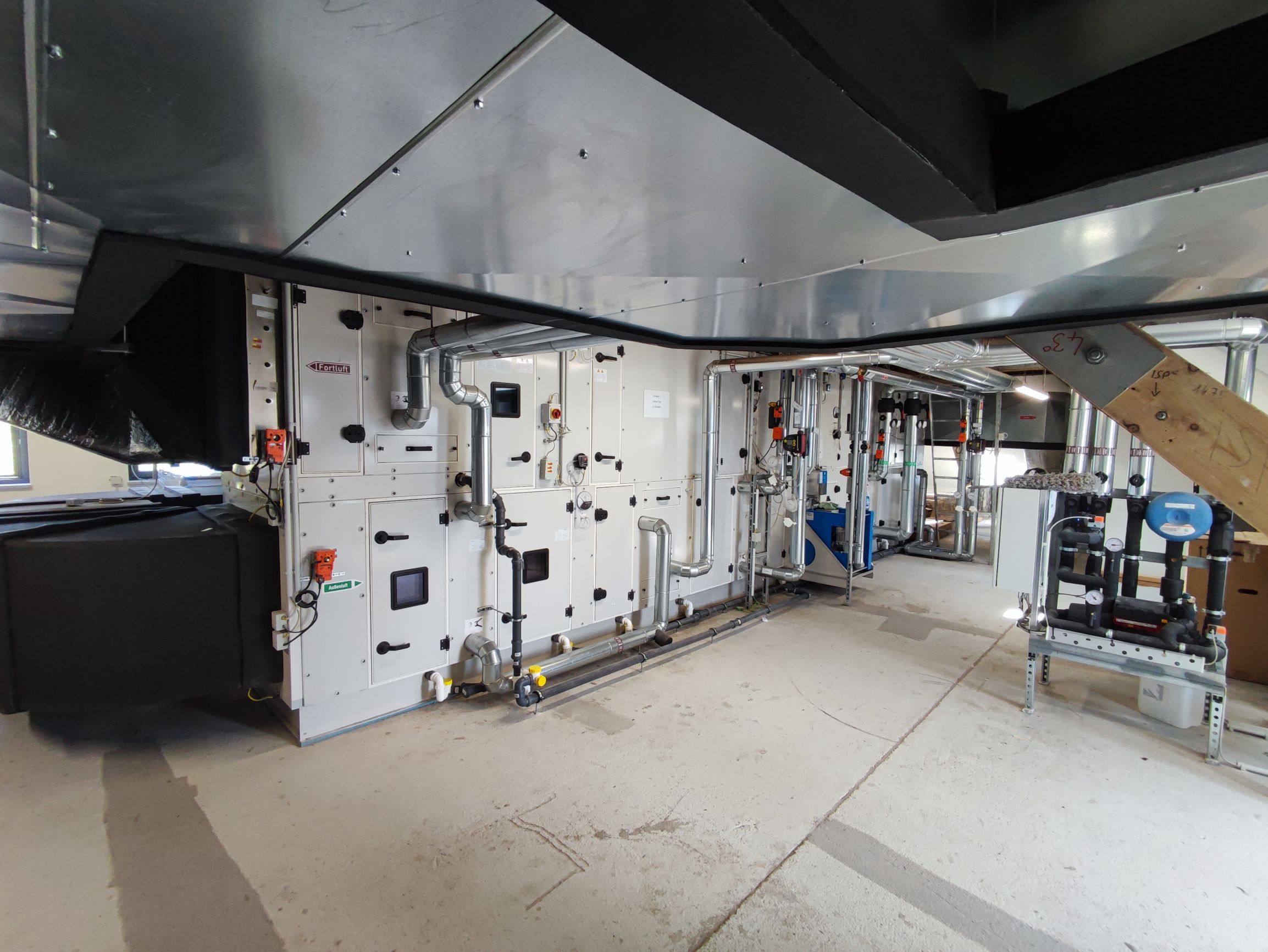 Neutralisationsanlage für Laborabwasser, Osmoseanlage zur Wasserenthärtung (Wasserhärte ca. 42°dH), Sicherung der Wasserhygiene über automatische Spülstationen, zentrale Warmwasserbereitung, Wärmeversorgung über Fernwärme-Dampfnetz, Gesamtleistung 500 kW, RLT-Anlage mit Wärmerückgewinnung, Klimaanlage mit WRG für Laborräume, Gesamtluftvolumen 13.000 m³/h, Klimatisierung EDV-, Labor- und Seminarräume, Gesamtleistung 330 kW, Umluftkühlung in Laborräume, Versorgung mit technischen Gasen Druckluft, Stickstoff (gasförmig und flüssig) und Kohlenstoffdioxid, Hand-Feuerlöscher, separate Steigleitung trocken, raumweise Regelung der bedarfsgeführten Belange, Kommunikationsschnittstellen zu sicherheitsrelevanten Themen und Behörden, Visualisierungsoberfläche auf der GLT zur einfachen Bedienung